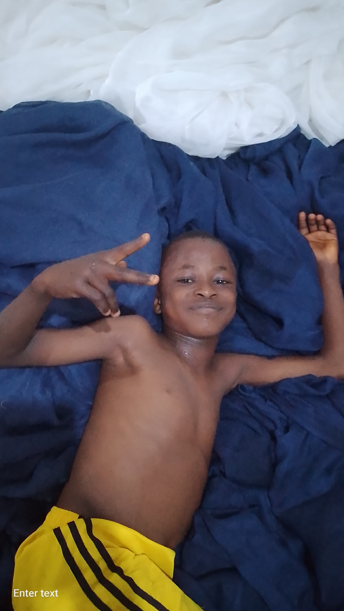 A juvenile male with dark skin is depicted lying supine, facing the viewer, within an indoor domestic environment in the city of Unknown, Unknown