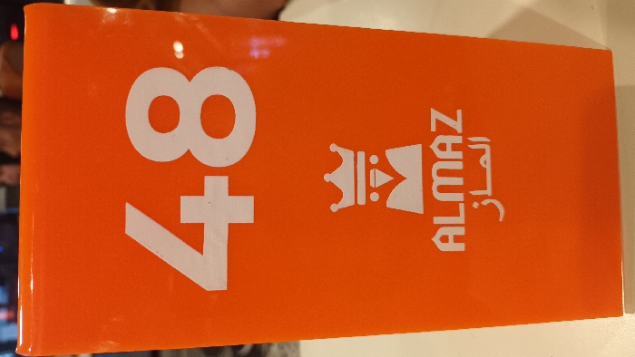 The image displays an upright, glossy, orange rectangular table number display, positioned on a light-colored, flat surface, presumably a table, in an indoor establishment in Lhokseumawe, Indonesia. The display features the white numerical designation '48' at the top. Below the numbers, a white stylized logo of a crowned, abstract figure is centered. Underneath the logo, the word 'ALMAZ' in white capital letters appears, followed by its Arabic transliteration 'الماز'. The background is blurred, showing indistinct forms consistent with people and ambient lighting in a restaurant or cafe setting.