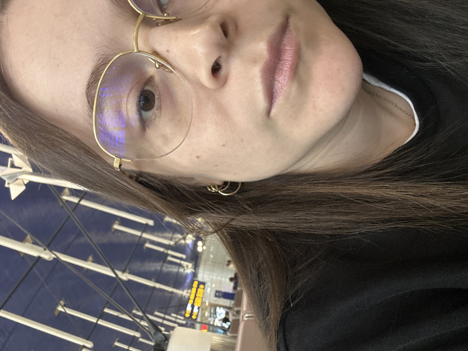 A woman in gold-rimmed glasses looks at the camera from a downward angle. She has light skin, brown hair, and pink lips. She wears a black shirt and a delicate gold necklace. Her earring is a cluster of small gold hoops. The background suggests a brightly lit airport terminal, with blue walls and overhead structural supports. The overall image has an informal, selfie-style quality.