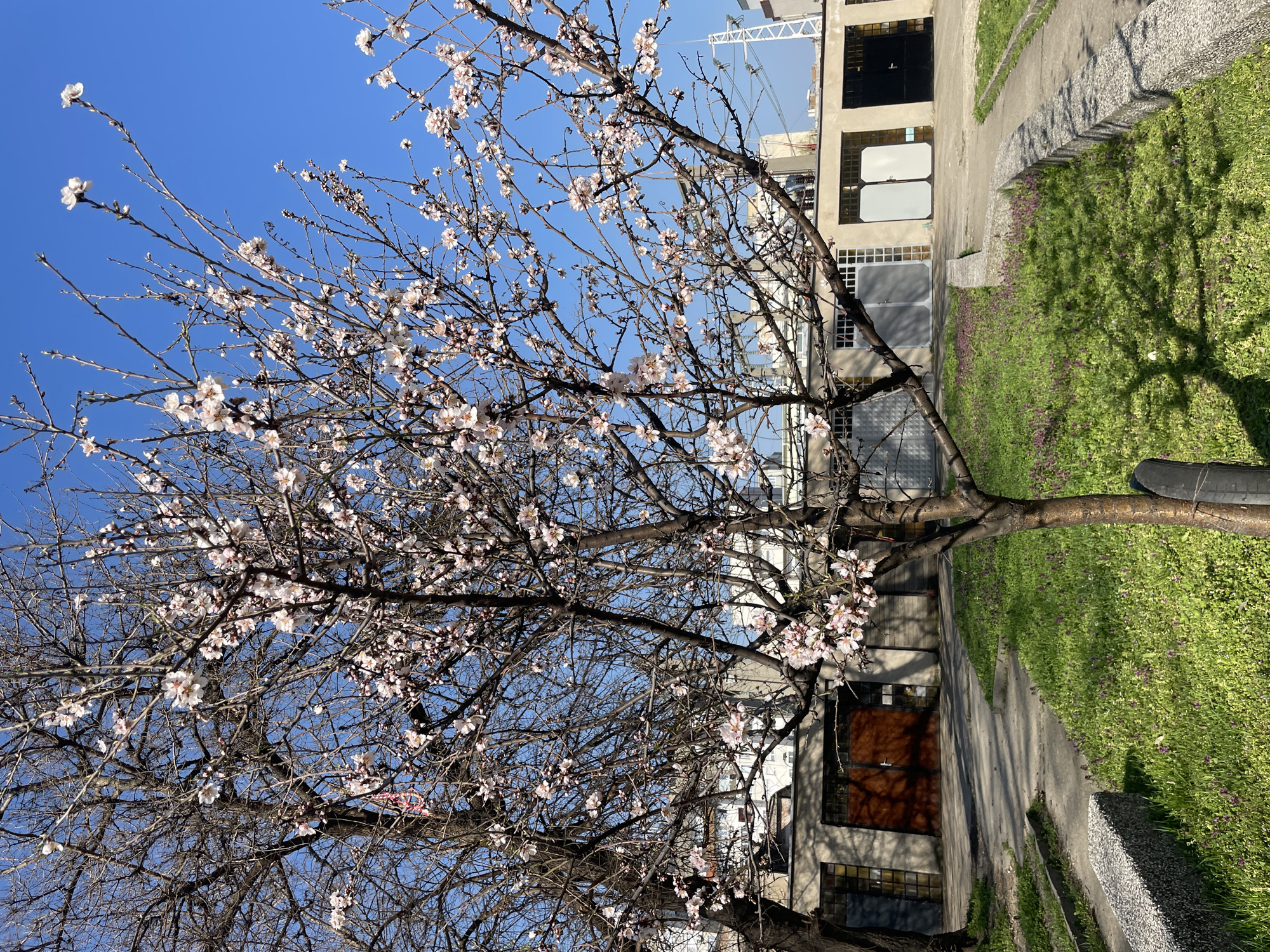 This image displays an urban outdoor environment in Silistra, Bulgaria, under a clear, bright blue sky. A prominent deciduous tree, adorned with numerous light pink and white blossoms, stands in the central foreground. Its branches are largely bare of leaves. To the left, a larger, leafless deciduous tree is partially visible. The ground is covered with vivid green grass, interspersed with small clusters of purple wildflowers. A winding concrete pathway traverses the grassy area, extending towards the background. A low, textured grey concrete bench is positioned on the left side of the pathway in the lower-left quadrant. In the midground, a row of single-story buildings, consistent with garages or utility structures, fronts the scene. These buildings feature beige and grey concrete facades and multiple closed doors, including dark brown double doors, grey and white double doors, and a black door, alongside small, gridded windows. Taller urban buildings are partially visible behind these structures. A white utility pole or similar structure with lines extends into the upper-right background. The scene is unpopulated. Strong sunlight casts distinct shadows from the trees and structures onto the grass and path.