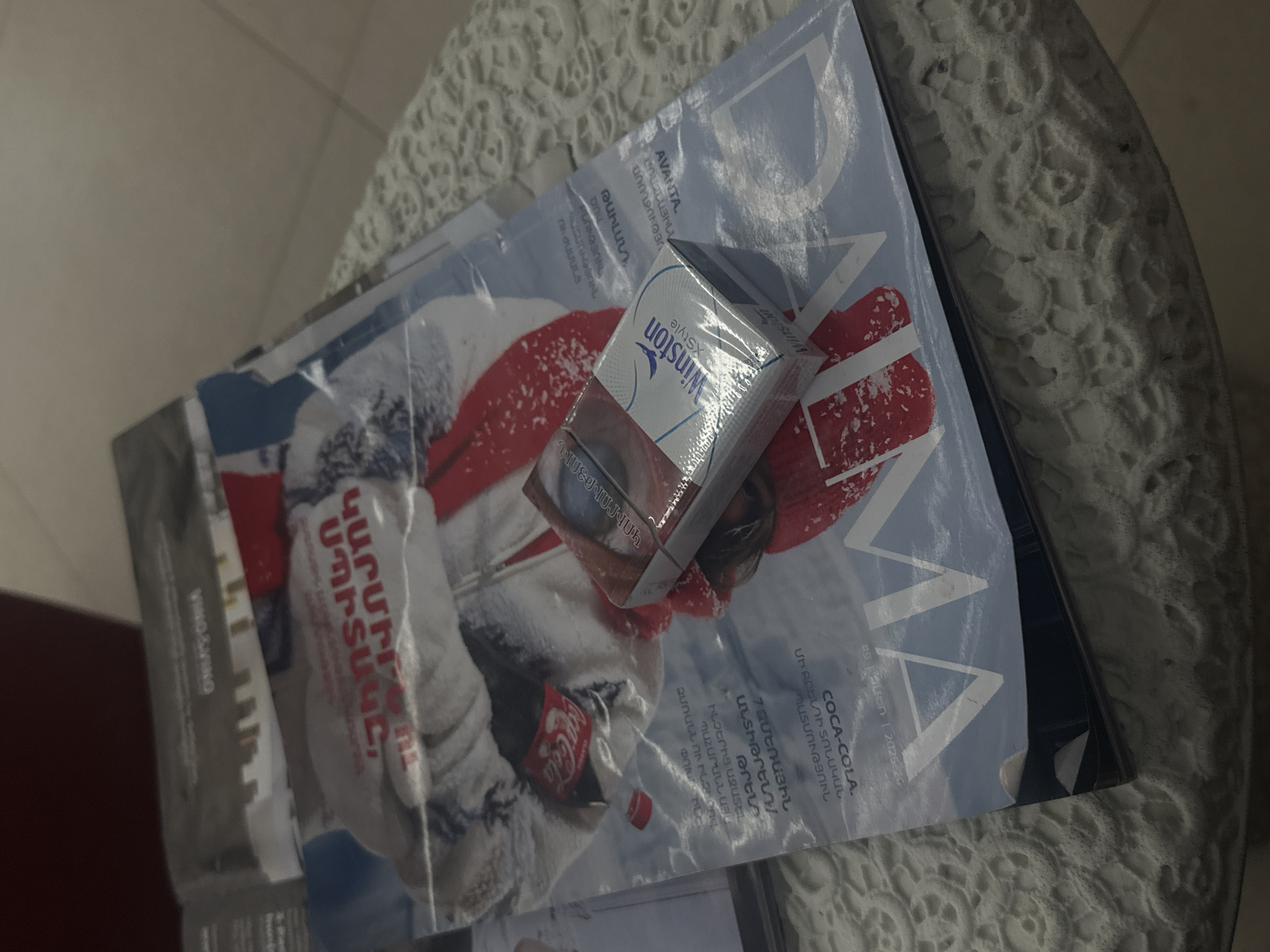 A close-up shot shows a pack of Winston cigarettes resting on a magazine. The magazine features an image of a snowy scene with a Coca-Cola logo visible. Some Armenian text is also visible on the magazine. The magazine and cigarettes are placed on a small, intricately designed table with a circular surface. The location appears to be Unknown, Unknown.