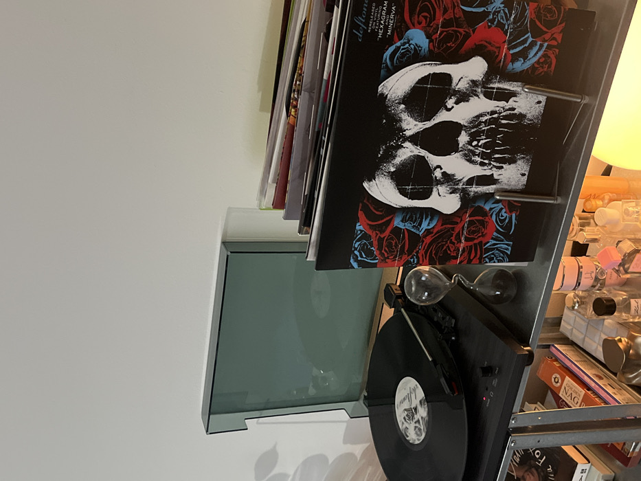 The image depicts an indoor scene within the City of Zagreb, Croatia, focusing on a multi-tiered metal shelf unit against a plain white wall. On the top shelf, a black turntable with an active tonearm is playing a black vinyl record; its translucent gray dust cover is open and resting against the wall. To the right of the turntable, a clear glass hourglass containing dark sand stands upright. Adjacent to the hourglass, a vinyl record sleeve is displayed vertically on a metal stand. The sleeve features a prominent white skull design surrounded by red and blue roses, with text indicating "Deftones" and song titles "HEXAGRAM" and "MINERVA." Behind this displayed sleeve, a stack of various other records or books is visible. The lower shelf holds multiple bottles, including what appear to be perfumes and cosmetics, alongside a luminous yellow object on the far right. No individuals are present in the scene.