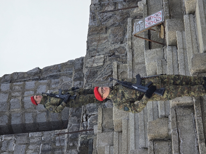 Two uniformed males stand guard on a wide stone staircase leading up to a large, grey, block-constructed stone monument, identified as the Shipka Monument in Shipka, Bulgaria. The sky overhead is overcast. The lower individual, positioned centrally in the mid-ground, is a male wearing a red beret, black-rimmed glasses, a green, brown, and black camouflage uniform with a patch on the left sleeve depicting a lion within a shield, black gloves, and dark boots. He stands erect, facing slightly right, holding a black assault rifle (AK variant) vertically with the muzzle pointed upwards, the stock resting near his right hip. The upper individual, positioned several steps higher and further back towards the monument, is also a male. He wears a red beret, a similar camouflage uniform, and black gloves. He holds an identical black assault rifle in a similar vertical position, angled slightly differently. His gaze is directed towards the right side of the frame. To the right of the lower individual, on the steps, an A-frame signboard is visible. It displays text in Bulgarian, an arrow pointing right, and a series of pictograms indicating prohibitions: a camera with a red slash (no photography/filming), a speaker with a red slash (no loud noise), a drink cup with a red slash (no open beverages), a pistol with a red slash (no firearms), and a dog with a red slash (no pets). The stone monument, composed of large, irregular grey blocks, forms the backdrop, partially obscuring an arched entrance behind the upper guard. Some thin metal railings are present on the steps between the two individuals.