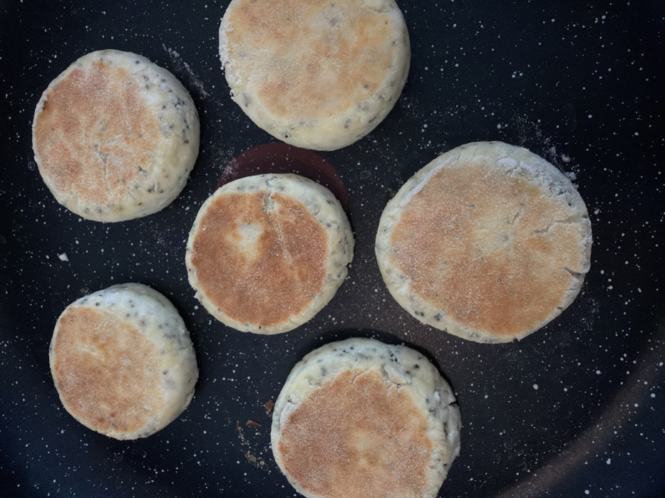 Six circular, dough-based food items are depicted cooking on a black non-stick frying pan
