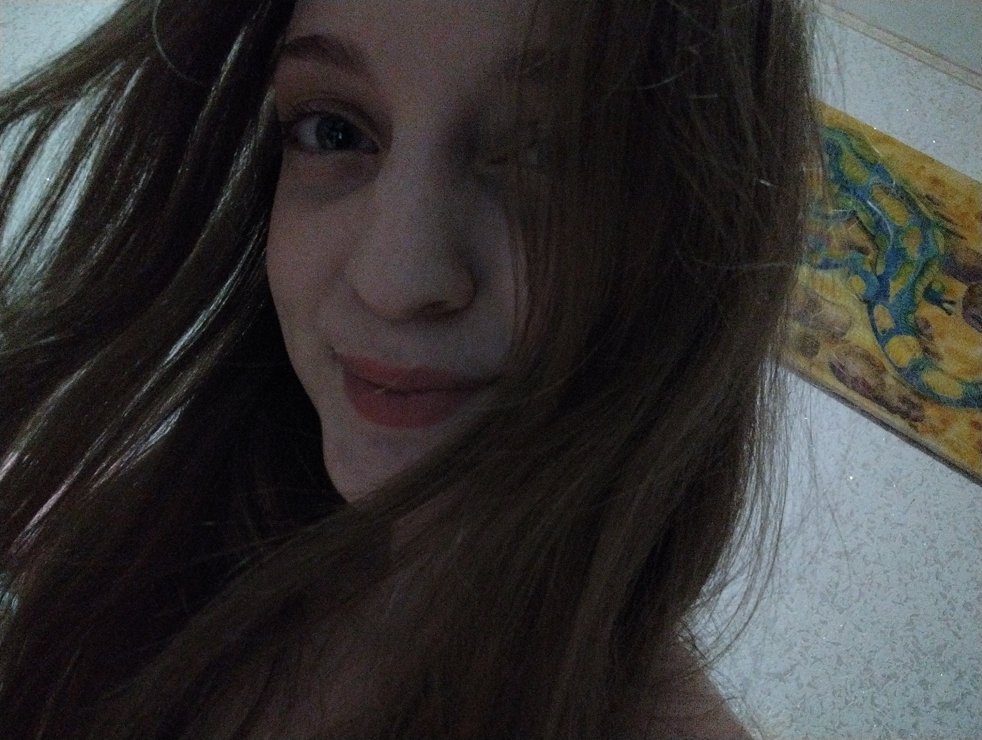 A portrait of a young woman is in the image. Her light skin and long brown hair frame her face, obscuring part of her left eye and side of the face. She has a light complexion, and a subtle smile is visible. The lighting is dim, and the background is slightly out of focus with a yellow, blue, and white patterned image on the wall. There's not enough information to determine if this image was taken in Saratov, Russia.