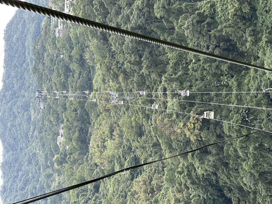 A vertical shot reveals a lush, green mountain landscape traversed by a gondola lift system. Overhead cables dominate the frame, with numerous gondola cabins suspended. The dense forest stretches across the background, broken only by glimpses of buildings near the top. The scene is taken from a gondola car looking out.