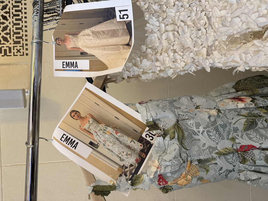 Two dresses hang on a rack. The first dress, adorned with delicate white flowers, is overlaid by a picture of a woman wearing a similar dress. The image has the name "EMMA" and number "51" printed on it. Beneath, the second dress features a floral pattern with shades of green, red, and blue lace. A similar picture is attached, labeled "EMMA" and "30." Both dresses are partially visible.