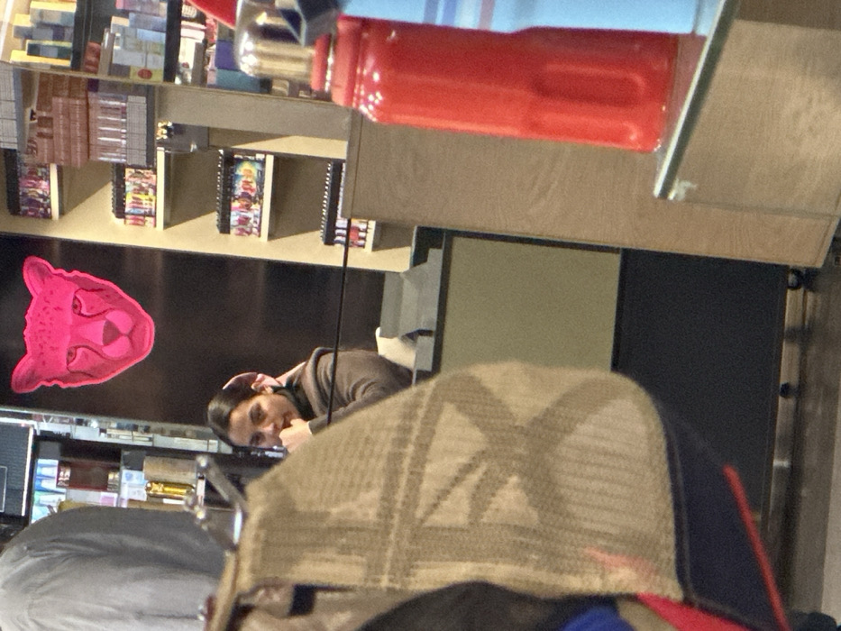 The image depicts an indoor retail environment, specified as Barza Municipality, Syria. In the mid-ground, a female individual with dark hair pulled back is seated behind a light-colored counter. She is wearing a dark turtleneck under a brown jacket, with a light pink accessory visible on the right side of her head. Her right hand is positioned near her mouth or chin, and her gaze is directed towards the left. Behind her, a prominent, brightly illuminated pink graphic of a cheetah's head is displayed on a dark panel. To the right of the cheetah graphic, multiple shelves are visible, stocked with numerous colorful products, consistent with cosmetics or retail items. In the immediate foreground, a person is partially obscured, largely by a light-colored, meshed object, possibly a bag or part of an infant carrier. To the far right in the foreground, a tall, red cylindrical object with a metallic silver top stands on a glass surface, with a blue object partially visible beside it.
