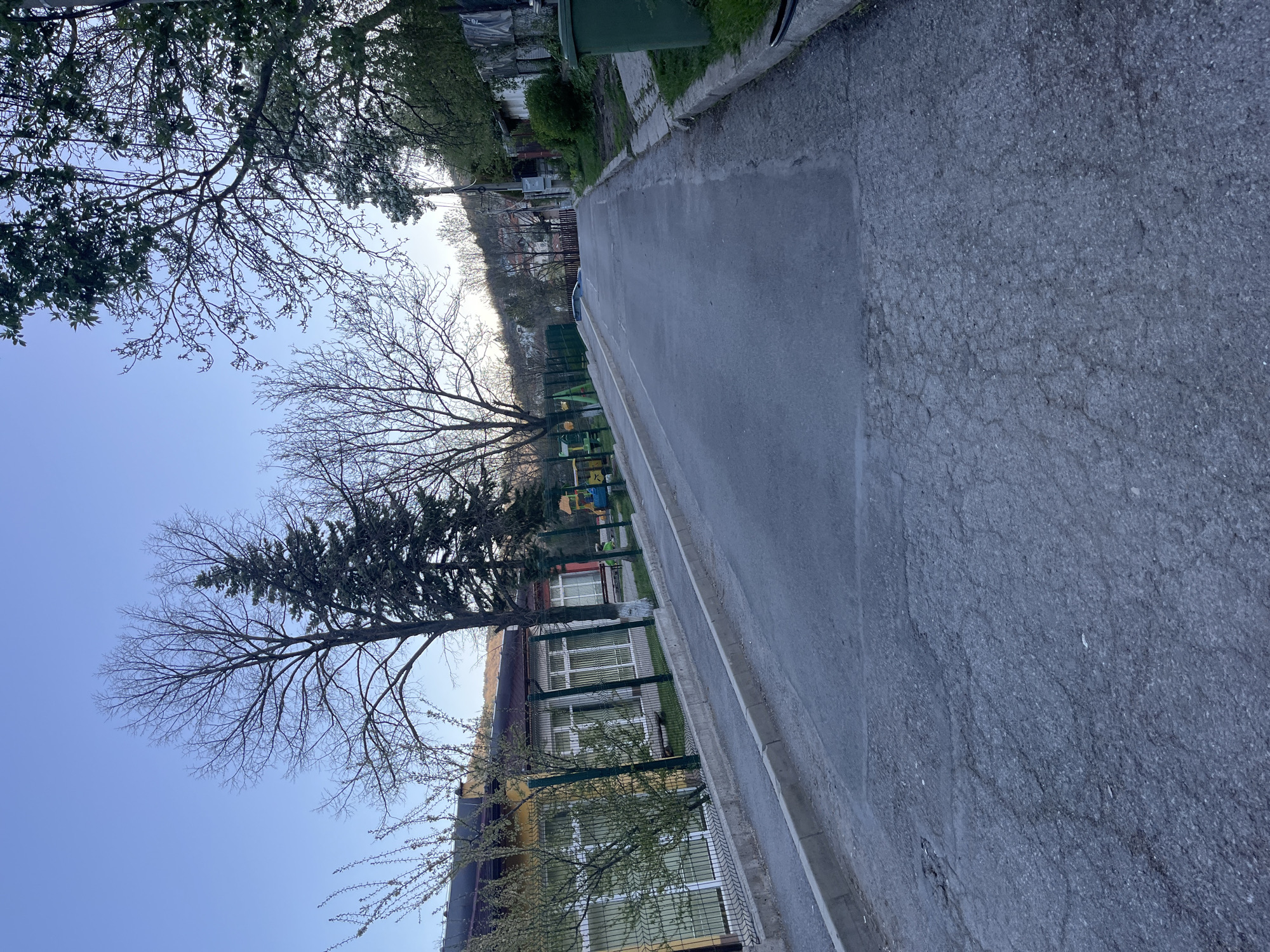 The image depicts a street in Vladaya, Bulgaria. The road is asphalt, showing signs of wear and tear. On the right side of the road is a curb. Adjacent to the road is a building with windows and a fence. Trees line the street. The sky is visible in the upper left portion of the frame. There are no people visible.