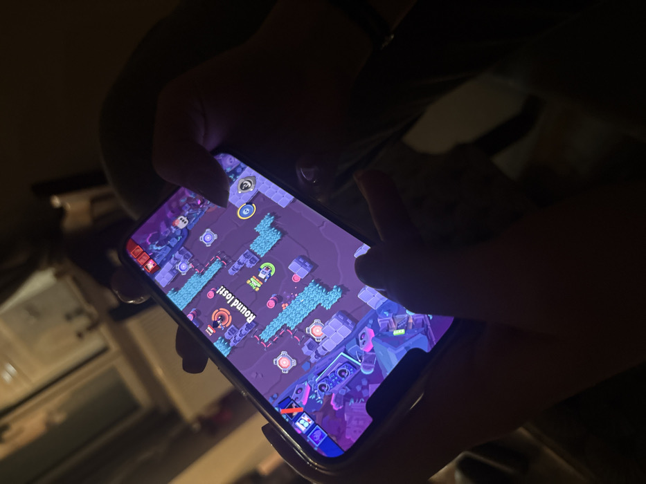 The scene is set indoors in Sofronievo, Bulgaria, under dim lighting conditions. A pair of human hands holds a smartphone horizontally, actively engaged in playing the mobile video game "Brawl Stars." The smartphone screen prominently displays the game's top-down perspective interface, featuring a map with purple ground, blue water-like features, gray structural elements, and various in-game icons. The message "Round lost!" is displayed in white text with a red border near the center of the screen. The individual's thumbs and fingers are positioned over the on-screen controls, with the left hand's thumb near the virtual joystick and the right hand's thumb and index finger near action buttons. A dark bracelet or band is visible on the right wrist. The background is out of focus, showing blurred indoor elements and distant light sources, possibly from a window or other fixtures.