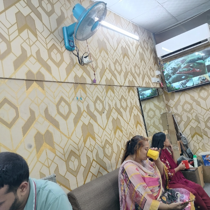Inside a room with patterned wallpaper and a blue fan, two women sit on a grey couch. One woman in pink drinks from a yellow cup while looking at her phone. The other, in maroon, holds a red cup. A man in a mint green shirt sits partially in the foreground. A surveillance monitor and an air conditioning unit are mounted on the wall.
