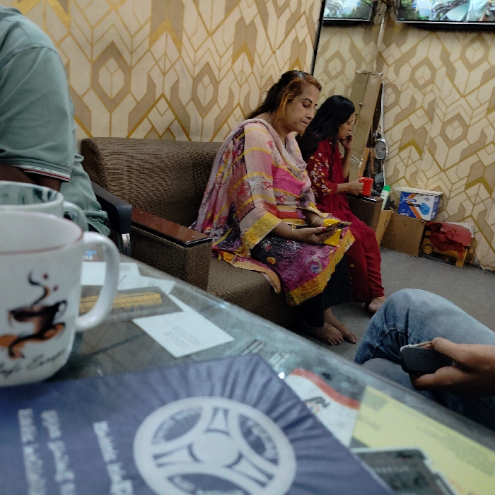 A woman wearing a pink and yellow patterned shawl is seated on a brown couch, looking at her phone. Beside her, another woman in a red dress holds a small red cup. The background features a patterned wall and various household items. In the foreground, a coffee cup sits on a glass table, next to a blue book. A person wearing jeans holds a smartphone in their hand.