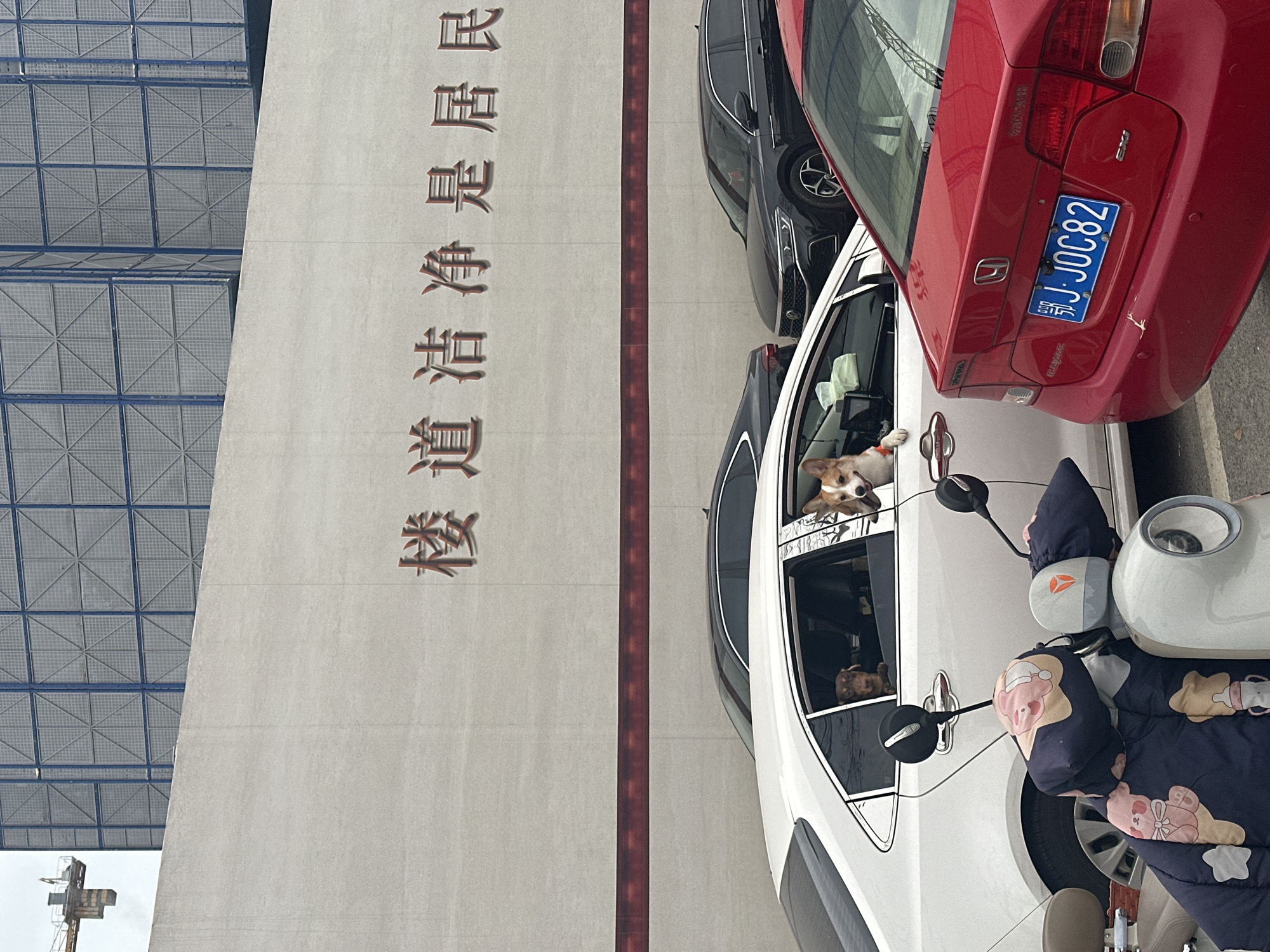 The image depicts an urban street scene in Jiangning District, China, characterized by parked vehicles against a building backdrop. In the lower-left foreground, the front section of a light-colored scooter is visible, featuring a dark blue padded cover adorned with pink cartoon bears and baby bottles over its handlebars. Adjacent to the scooter, in the midground, a white sedan is parked. Two dogs are observing from its open rear windows: a Pembroke Welsh Corgi with an orange collar partially extends its head from the passenger-side window, while a brown short-haired dog looks out from the driver-side rear window. Directly behind the white sedan, the rear of a red Honda sedan is visible on the right, displaying a blue Chinese license plate, "苏 J·J0C82" (Jiangsu province, Yancheng city prefix). Further in the background, two black sedans are parked. The upper half of the image features a large, light-colored building wall displaying prominent reddish-brown Chinese characters, "楼道洁净是居民" (Clean corridors are a resident's responsibility), set above a dark red horizontal stripe. Above this wall, a modern building with a blue grid-patterned facade and the arm of a construction crane are partially visible against an overcast sky.