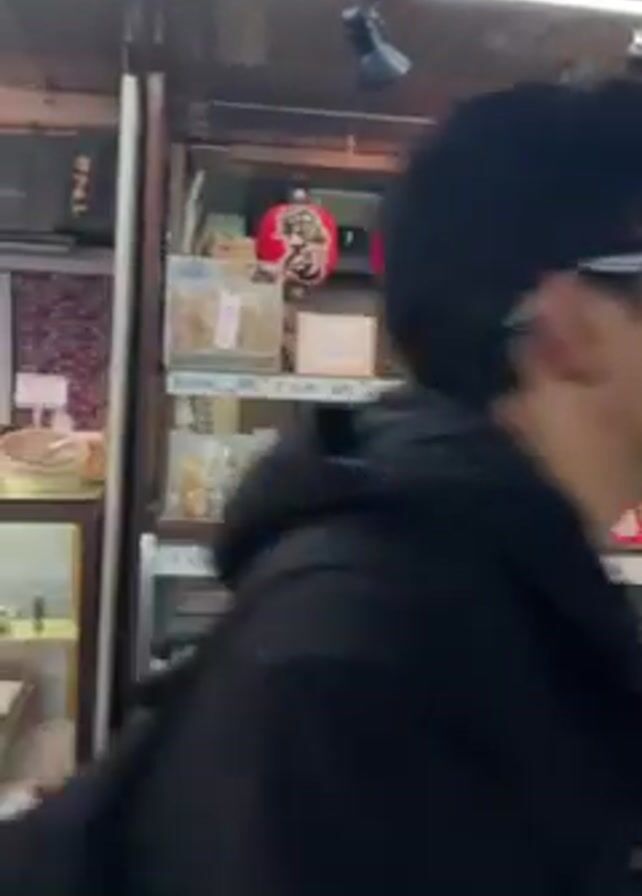 crowded street in Japan. The street is lined with shops selling various goods, including food. There are many people walking along the street, including a man in a grey jacket and a black baseball cap. There are also traditional red lanterns hanging from the shops. The sky is dark, suggesting it is evening.