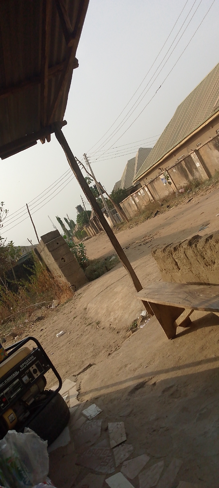 A dusty street scene depicts buildings with pitched metal roofs. A wooden bench sits on a dirt path. Power lines stretch across a hazy sky. A corrugated metal awning is supported by a wooden post in the foreground. Debris and a generator are visible near the bottom of the frame. The overall composition appears tilted.