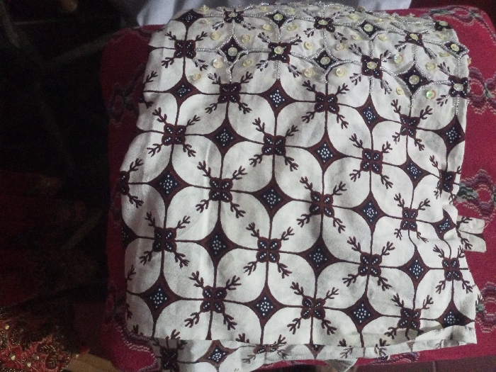 This image depicts a folded piece of textile, likely a garment, placed on a red patterned surface within an indoor setting in Bamhori, India. The primary textile is off-white with a repeating brown and dark blue geometric pattern, reminiscent of batik. The pattern features interlocking brown circles, each containing a dark brown, branching, tree-like motif. Between these circles are dark blue diamond shapes with small white dot clusters. The upper edge of the textile is embellished with silver-colored embroidery or beadwork forming a wavy line, interspersed with small, circular, light-colored sequins or beads. The textile lies partially over a red fabric with an indistinct pattern, visible on the right side and underneath. The background to the left and top is dark and out of focus. No people are visible, and no actions or interactions are depicted.