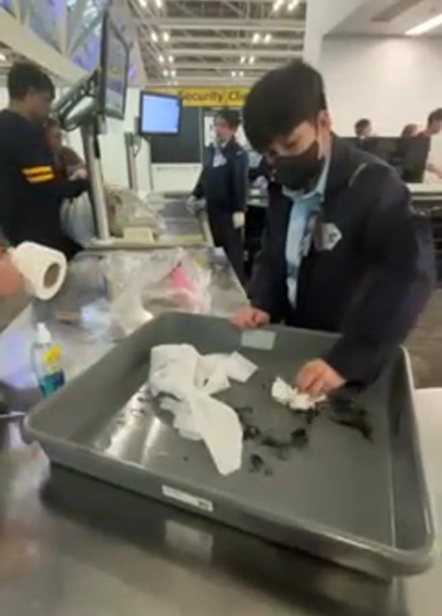 scene at an airport security checkpoint. An employee wearing a mask, a dark blue jacket, and a light blue shirt is wiping down a grey tray with a white cloth. The tray contains some dark residue or debris. Behind the employee, other people are moving through the security check. A sign reading "Security Checkpoint" is visible in the background. The airport setting is characterized by bright lighting and a modern architectural design with metal beams. The overall atmosphere appears to be busy as people navigate through the security process.