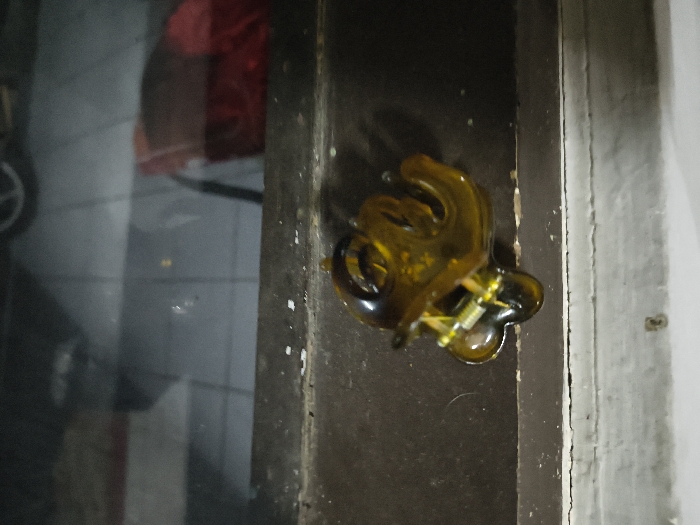 In Tarqumiyah, Palestinian Territory, an amber-colored, translucent hair claw clip, featuring a multi-lobed design and a visible metal spring mechanism, rests partially open on a dark brown horizontal surface. This surface is consistent with a window sill or frame. Below it, a lighter, off-white textured surface, possibly an interior wall segment, exhibits minor cracks and irregularities. Through the glass visible above the dark surface, a blurred outdoor scene is depicted, including grey tiled pavement, a vehicle wheel rim on the upper left, and a diffuse red object to the right, consistent with an exterior view or reflection under low light conditions. No individuals are present.