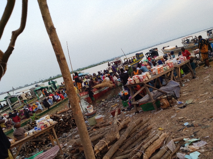 A bustling marketplace scene unfolds at a waterfront. Numerous people gather near boats, some selling goods displayed on wooden tables. These include packaged food and other items. Stacks of firewood lie on the ground, adding to the crowded atmosphere. The sky appears overcast, casting a soft light over the lively commercial activity. The overall scene suggests a vibrant trade hub.