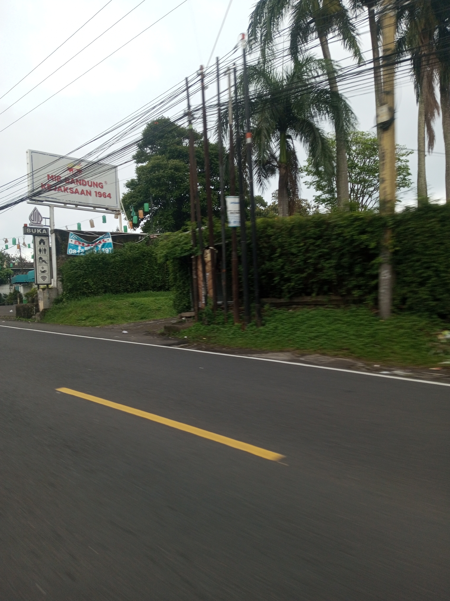 roadside view in what appears to be an urban environment. A black asphalt road with a yellow line marking runs across the lower portion of the frame. Vegetation, including grass and a trimmed hedge, borders the road. Beyond the vegetation are utility poles with a dense network of wires. A tall sign is visible on the left, along with another sign with "BUKA" on it and pictograms. Additional signage and what appears to be a tarp are also present. Palm trees are spaced along the right side of the frame. The sky is overcast. The location is possibly Taunggyi, Myanmar, based on the signage present.