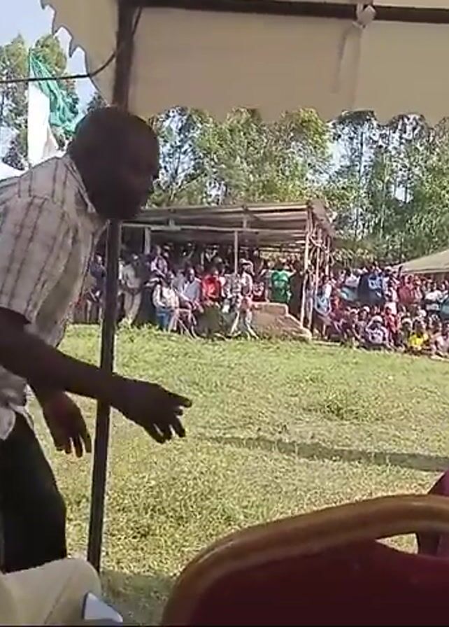 The video captures an outdoor event with a large crowd gathered on a grassy field, partially under a temporary tent. Under the tent, several seated men, including one wearing a red cap, observe the scene. A man in a plaid shirt moves around, appearing to assist or coordinate. In front of the seated men, a person in white clothing stands and seems to be addressing the crowd. Behind them, a diverse group of people, many wearing white, are seated on the ground facing the tent. In the background, there is a building with a green roof and some trees. The video appears to be taken from under the tent. A flag is seen in the background. Some people are taking photos or videos with their phones.
