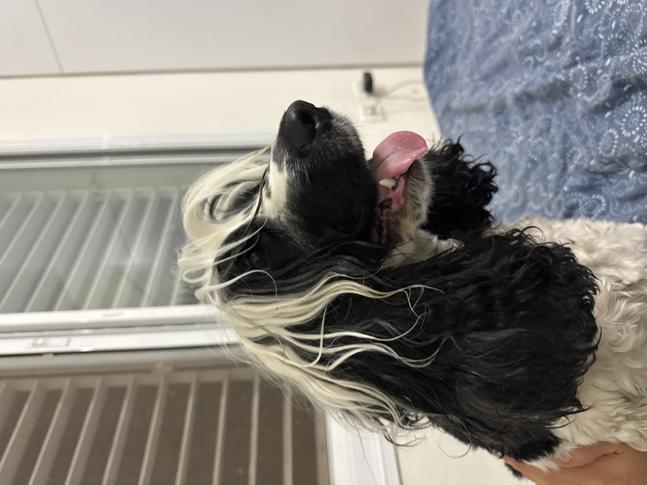 A black and white dog with long, wavy fur and distinctive blonde/white hair on its head is depicted in profile, facing right