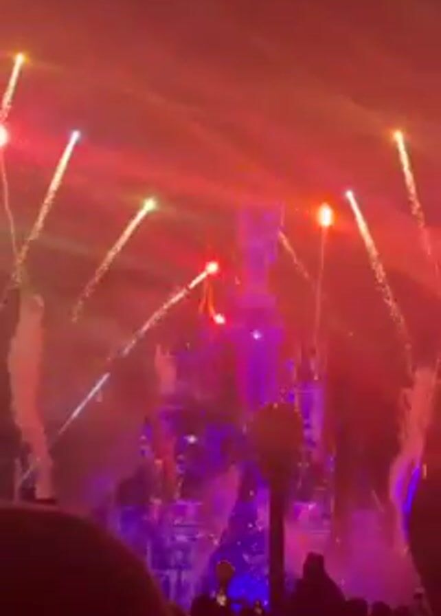 nighttime fireworks display in front of Sleeping Beauty's castle. The castle is bathed in purple and blue light. Fireworks explode around the castle, with red, green, and white sparkles. Smoke from the fireworks fills the air. A crowd of people can be seen in the foreground, but their faces are obscured. A lamppost is also visible. The camera is handheld and shaky.