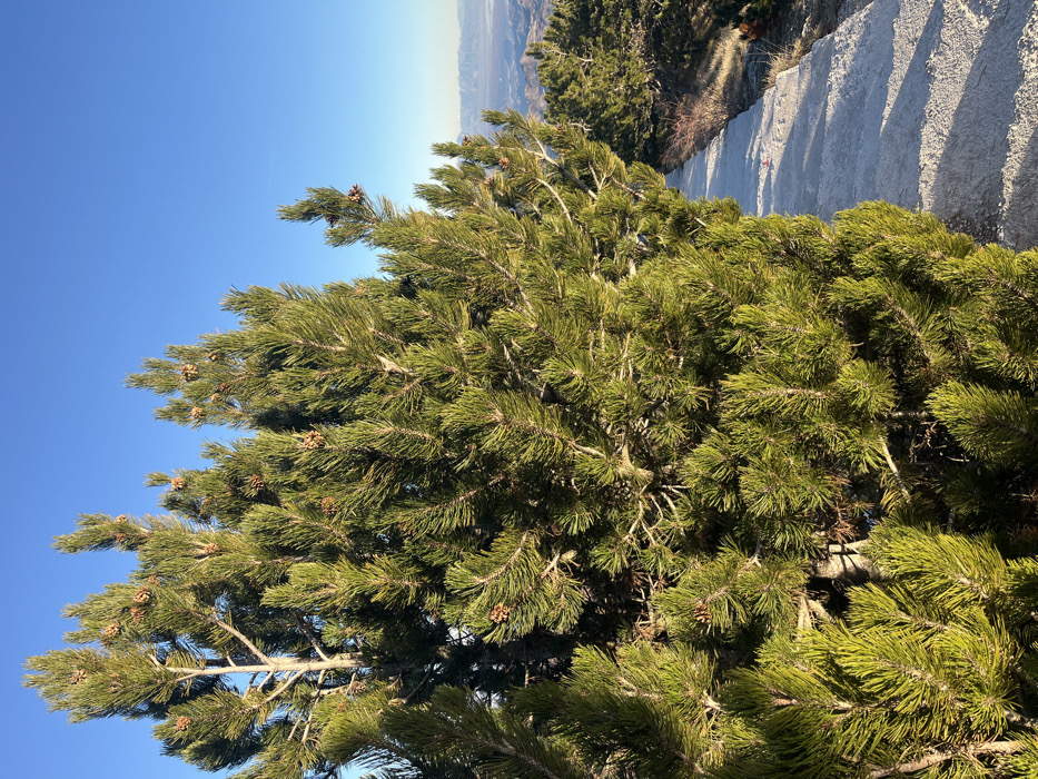 A close-up view reveals a lush green pine tree against a clear blue sky. Cones are visible on the branches. The ground, possibly a rocky path, is partly visible with sunlight casting long shadows. A glimpse of a distant, hazy landscape is seen in the background, suggesting a high-altitude or mountainous location. Other coniferous trees are seen near the rock path.
