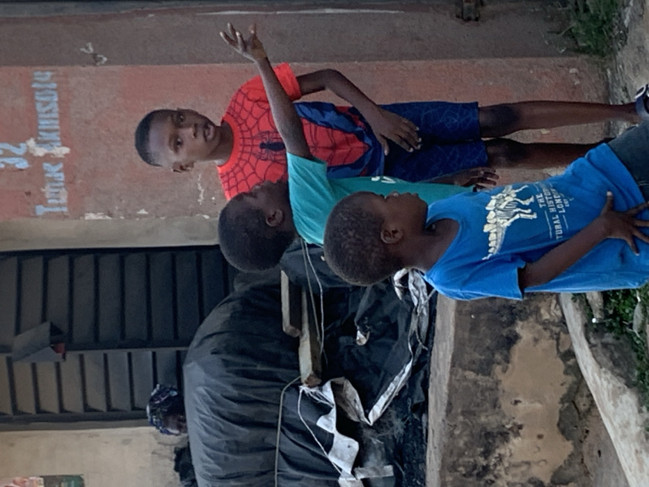 Three young boys stand outside a building. One wears a red Spiderman shirt with blue shorts, another a turquoise shirt, and the third a blue shirt featuring a dinosaur. The boy in the Spiderman shirt raises his hand. Behind them, a woman in a headscarf is visible, standing near a dark, possibly tarp-covered, object. The building's exterior is worn with visible text in a lighter color on a darker background. Some greenery is present on the right side of the image.