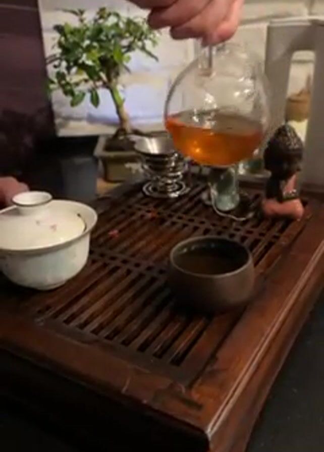 person pouring tea from a glass pitcher into a small brown teacup on a dark wood tea tray