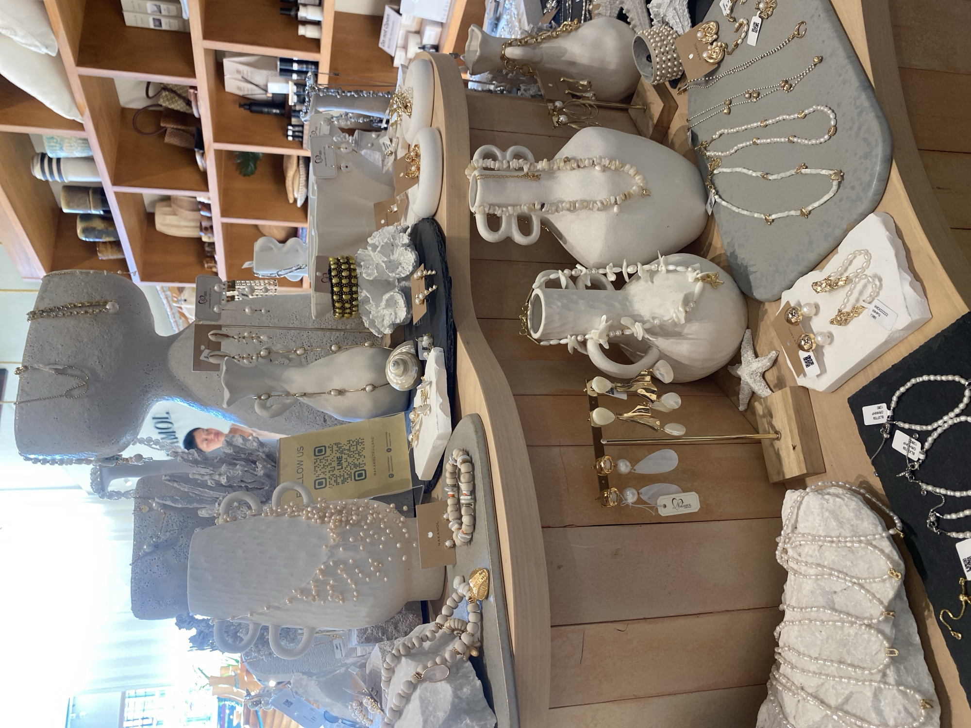 A well-lit retail space in Phuket City Municipality, Thailand displays a selection of jewelry. The jewelry is arranged on a multi-tiered, wooden display. The jewelry includes necklaces, bracelets, and earrings featuring pearls, shells, and gold accents. The items are placed on light-colored vases and stones. Shelves are visible in the background filled with decorative items.
