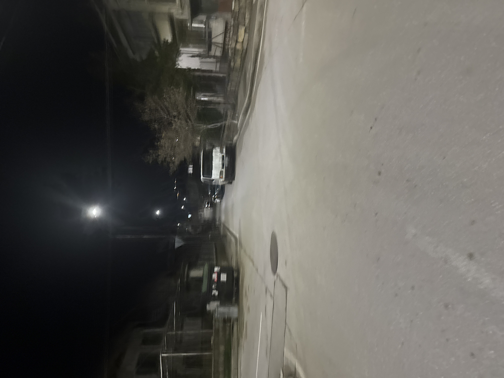 The image depicts a nighttime street scene in Dryanovo, Bulgaria. The asphalt road surface, a light gray color, shows visible seams and scattered dark stains. A circular metal manhole cover is located in the middle ground, slightly to the right of the center. A solid white line marks the left edge of the immediate traffic lane. On the left side of the street, a sidewalk runs parallel to a structure, possibly a fence or barrier, and an older, multi-story building. Two trash receptacles are positioned on this side: a rectangular gray bin and a larger, dark-colored bin with green accents. Further down the street on the left, additional buildings are visible. On the right side of the street, a raised curb separates the roadway from a sidewalk and a narrow strip of land. A light-colored, likely white, panel van is parked facing away from the viewer. Behind the van, a deciduous tree with visible bare branches stands. Further down, another building, possibly featuring a stone foundation, is present. The scene is illuminated by multiple artificial streetlights, casting localized light and creating areas of shadow. In the distance, the street curves or continues, with additional parked or moving vehicles and buildings lining both sides. No individuals are present or engaged in any discernible activity. The sky is dark, indicating night conditions. A triangular road sign is partially visible on a pole on the left side of the road.