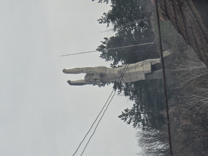 The image displays a tall, concrete monument, identified as the "Monument to the Fallen in the Anti-Fascist Struggle," situated on a hillside in Cherven Bryag, Bulgaria. The monument depicts a stylized human torso with both arms raised vertically above the head, hands clenched into fists. Its surface is light gray, characterized by angular, brutalist construction. The monument is set against a backdrop of dark green coniferous trees, with bare deciduous trees visible on the lower slopes. Two dark, horizontal power lines cross the midground of the frame. A slender, dark pole or antenna is positioned to the right of the monument. A section of a reddish-brown tiled roof occupies the lower right foreground. The sky above is uniformly overcast and light gray. No individuals are present.