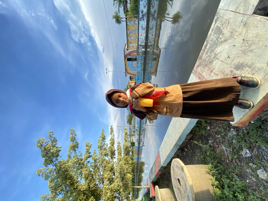 - "A young female, wearing a brown hijab, light brown uniform top with darker brown stripes, a red and white scarf, a dark brown long skirt, and black and red athletic shoes, stands on a painted concrete ledge next to a canal in Kalitengah, Indonesia" by FM-htxI33, licensed under CC BY 4.0