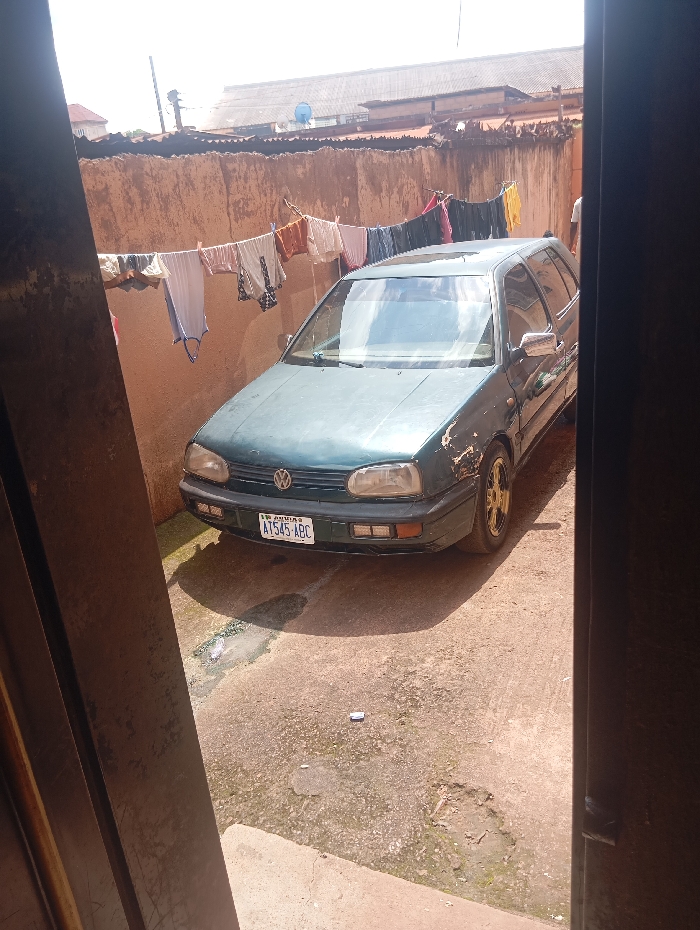 An outdoor scene in a residential area of Enugu, Nigeria, captured from inside a doorway looking into a concrete and dirt yard under bright daylight. A dark green Volkswagen Golf Mk3 station wagon, bearing Nigerian license plate "ENUGU A1545 ABC", is parked diagonally in the center, facing the left foreground. The vehicle exhibits cosmetic damage, including paint loss and scratches, particularly on the front passenger-side bumper and fender. It is fitted with multi-spoke, possibly aftermarket, yellow-gold alloy wheels on the visible passenger side. A clothesline laden with various garments, including underwear and shirts, is strung horizontally across the mid-ground, extending from a weathered, light brown plastered boundary wall on the left towards the right. Beyond this wall, in the upper background, corrugated metal rooftops, utility poles, and a blue satellite dish are visible, indicating adjacent properties. The yard's ground consists of worn concrete and patchy dirt, showing depressions and a small, dark, wet stain near the car's front bumper. A white, rectangular object, possibly a discarded cigarette packet, lies on the ground to the right of the stain. A partial human figure, visible from the upper torso up, in a light-colored shirt, is positioned behind the car near the far right wall. The image is framed by dark vertical door edges on both the left and right sides.