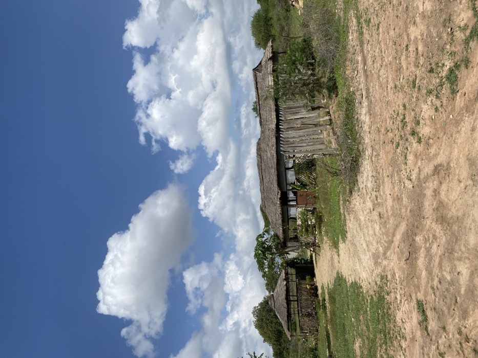 An outdoor scene in Makutano-Mwala ward, Kenya, depicts two rustic buildings under a bright blue sky with numerous white cumulus clouds