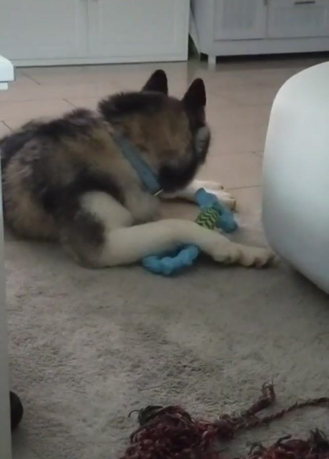 - "Husky-type dog lying on a gray rug, chewing on a blue and green toy" by FM-M4lpO2, licensed under CC BY 4.0