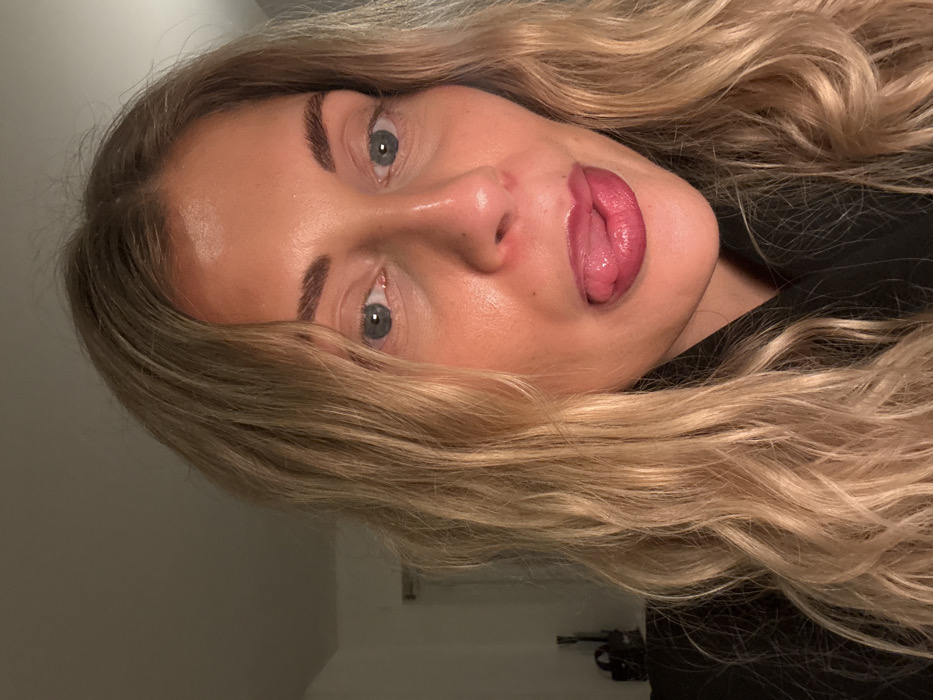 A woman with blonde, wavy hair and fair skin fills the frame. She has prominent cheekbones, thick eyebrows, and blue eyes. Her lips are full and glossed, with her tongue slightly protruding. The background is a dimly lit room, and she is wearing a dark-colored garment. The photo is taken at an angle, giving a slightly tilted perspective of the woman's face.
