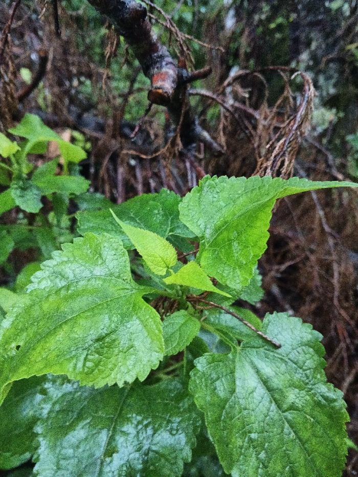 Lush green leaves fill the frame, some glistening as if wet. Their edges are toothed, and veins create a subtle texture on their surfaces. Behind the leaves is a backdrop of tangled, dry branches and twigs in brown and gray hues, creating depth and contrast. A thicker, darker branch is positioned prominently at the top of the image.