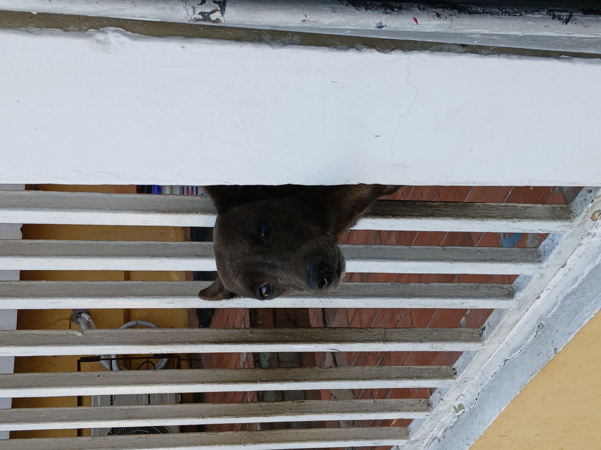 dark-furred dog peeking through a white, slatted structure, likely a fence or railing. The dog's head is upside down from the perspective of the viewer. The background seen through the slats includes a red brick-like surface and a partial view of what seems to be an air conditioning unit and its associated tubing. The dog is the primary subject, and the overall setting suggests an urban or residential area. It is not possible to identify its location in Ciudad Guayana.