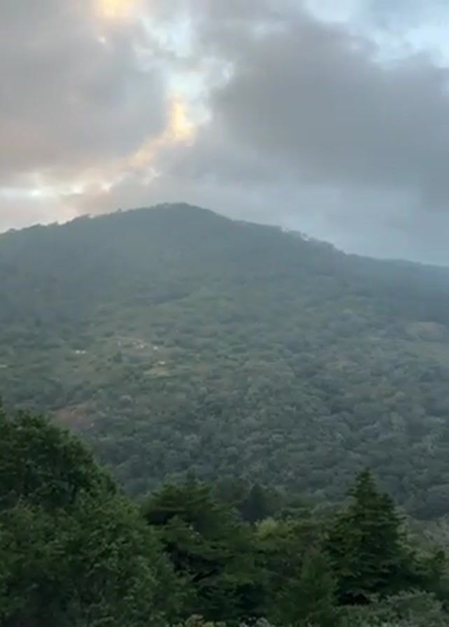 mountain covered in dense green trees. The sky is overcast with thick, gray clouds. There is a small clearing visible on the mountainside where a cluster of structures may be located. The overall scene appears to be shot from an elevated position, possibly from another hillside.