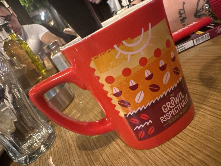 The image depicts an indoor scene within a commercial establishment in Stara Zagora, Bulgaria, captured at an approximate 45-degree counter-clockwise rotation. A red ceramic mug is the primary subject, resting on a light brown wood-grained tabletop. The mug's exterior features a multi-layered design: a dark red base band inscribed with "GROWN RESPECTFULLY" and "NESCAFÉ" in white text, an orange mid-section adorned with white and dark brown coffee bean illustrations, and a white stylized sun emblem near the top right. The mug has a white interior rim. Adjacent to the mug on the table, a clear, textured drinking glass is partially visible to the left. To the mug's right, a human left forearm, clad in a dark red long-sleeved garment, extends into the frame. A silver-colored bracelet encircles the wrist, and a tattoo composed of unidentifiable script is visible on the inner forearm. A dark red rectangular object, bearing a barcode label, is partially visible near the arm. The blurred background reveals reflections of a male individual wearing a white t-shirt and dark-framed glasses, facing away from the camera. A bottle containing an amber-colored liquid is also visible as a reflection or object in the background. The environment indicates a cafe or restaurant setting.