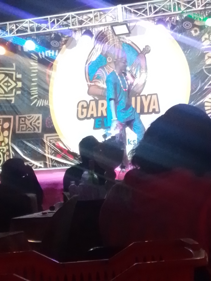 On stage, a person in a blue outfit and glasses stands before a circular backdrop with an image. "GARU NIYA" is prominently displayed, possibly the event's name. Behind the backdrop, stage lights and geometric patterns are visible. In the foreground, obscured by blurry figures, are people seated at tables, presumably an audience. The red railing of seats is also noticeable, giving context to the scene. The overall image quality is somewhat low, with limited details.