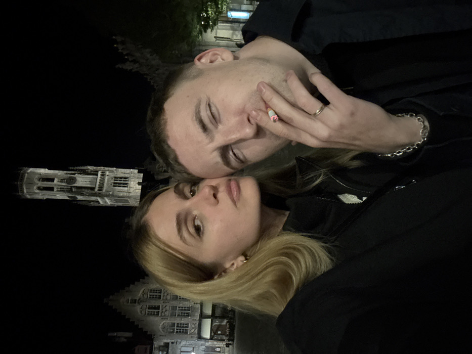 The image depicts a nighttime close-up photograph of a male and female in the city of Bruges, Belgium. In the background, the illuminated Belfry of Bruges stands prominently, with characteristic gabled Flemish architecture visible to its left. The female, on the left side of the frame, has blonde, shoulder-length hair and wears small gold hoop earrings and a dark, zippered jacket. She looks directly at the camera with a neutral expression. The male, on the right, has short dark hair and appears to be squinting with his right eye. He holds a lit cigarette with a pink and white filter between the thumb and forefinger of his right hand, positioned near his mouth. He wears a light-colored ring on his left ring finger and a silver-colored chain bracelet on his left wrist. Both individuals wear dark clothing. The scene is illuminated by ambient city lights, casting light on the subjects and the background architecture against a dark sky.