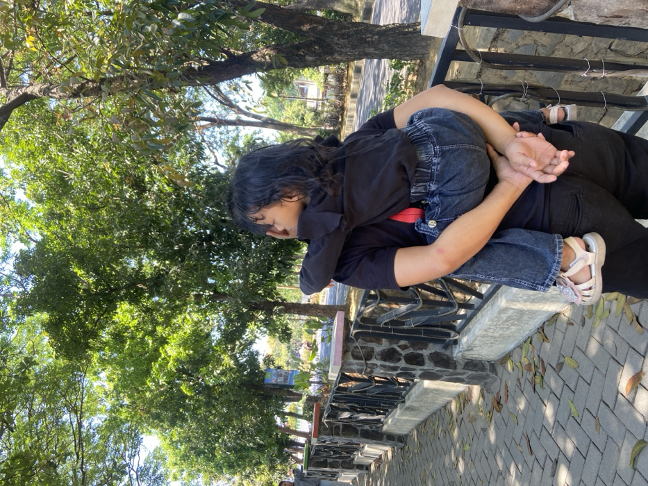 In Pagerwojo, Indonesia, a bright, sunny daytime scene depicts an adult carrying a young child on their back. The adult, wearing a black short-sleeved shirt and dark pants, supports the child by clasping their hands behind the child's legs. A small red mark is present on the adult's left bicep. The child, dressed in a black long-sleeved shirt, dark blue elastic-waist jeans, and light pink sandals, has dark, wavy hair. Their right hand is raised to their face, and their head is turned to the right. They stand on a paved pathway of light grey rectangular pavers, where fallen leaves are scattered. A low fence parallels the path on the right, constructed with a dark stone base, a light concrete cap, and black metal railings. Beyond the fence are numerous trees with dense green foliage, illuminated by direct sunlight. A paved road with faint yellow lines is visible in the background. A blue sign is partially obscured by trees in the mid-ground, and a figure is partially visible in the distant left background.