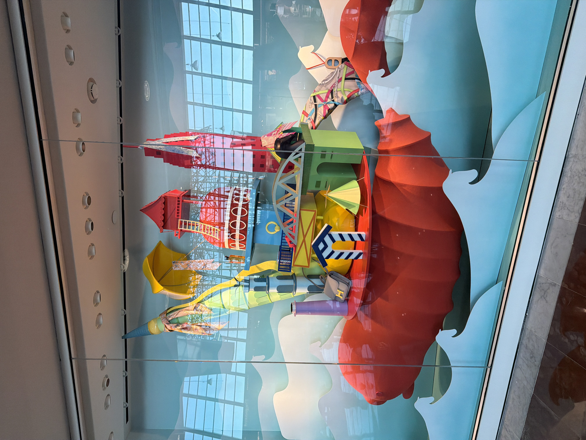 window display, likely in a retail setting. The display features an elaborate, colorful three-dimensional structure that resembles a whimsical cityscape or architectural model. The structure incorporates elements such as red towers, a yellow umbrella-like form, a rocket-shaped segment, and various other geometric shapes. It is constructed from materials that appear to be painted wood or similar lightweight materials. The display is set against a background of wavy shapes in shades of blue and white, which could represent water or clouds. The window reflects the outside environment, including a grid of windows and a bright, sunny sky. The background wall has circular holes and metal brackets along its edge. The presence of an Hermès handbag and a silk scarf integrated into the display strongly suggests that the image was taken at an Hermès store. Specific to Nice, France, the scene is located in the Hermès store in Nice.