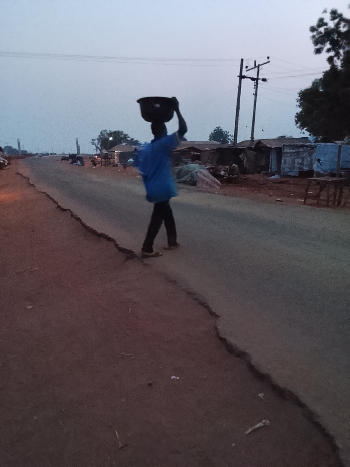 A person walks on a road carrying a basin on their head. They wear a blue shirt and dark pants. The road is flanked by unpaved areas. In the background are small makeshift structures, possibly shops or homes. A utility pole stands near the structures. The sky appears overcast, suggesting it might be dusk or dawn. The overall scene is simple and somewhat rural.