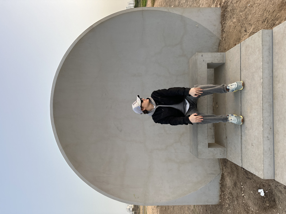 A person sits on concrete steps within a large, dome-like structure. The individual wears a dark jacket, grey jeans, sneakers, and a baseball cap, gazing upwards. The steps lead towards the open sky, positioned on the right. The backdrop consists of a clear sky and distant buildings on the horizon. The color palette is dominated by shades of grey, with hints of blue and brown from the sky and earth. The structure appears to be a public art installation or architectural feature in a natural setting.