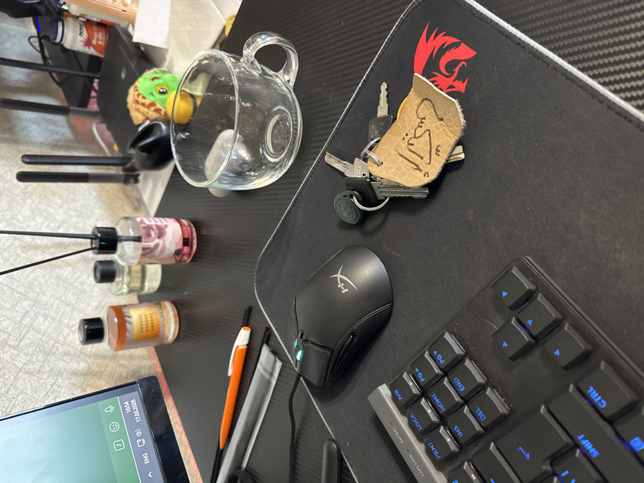 The scene depicts a desk workspace located in Chișinău, Moldova. The surface is dark, likely a textured desktop or table. In the foreground, a black mechanical keyboard with blue backlit keys (including "CAPS LOCK," "SHIFT," "CTRL," and navigation keys) is partially visible on the left. Adjacent to it, on a black mousepad featuring a partial red dragon logo with flames, rests a black HyperX gaming mouse illuminated with green LED lights on its scroll wheel. To the right of the mouse, a keyring holds multiple metal keys, including a small dark green fob and a larger, irregularly shaped light brown leather fob with an etched design resembling a heart and possibly Arabic script. Further back, a clear glass mug containing two small, light-colored stones is positioned. Behind the keyboard and mouse, an orange and white pen lies atop a clear plastic sleeve. On the far left, a portion of a laptop screen displays a Windows desktop, showing the time "16:54," the date "17.03.2026," and the language "ENG." Behind these items, three small bottles are arranged: an amber liquid bottle labeled "ANANAS & ORANGE," a smaller clear liquid bottle, and a pink-hued diffuser bottle with several black reeds inserted. The background on the right includes two black electronic antennas, a black electronic device (possibly a router), a small green and brown stuffed toy, and various other bottles and containers, one with a white label and purple cap. The wall behind the desk features a light-colored, patterned wallpaper.