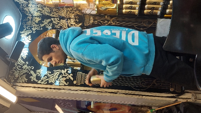 A man in a blue Diesel hoodie shakes a cocktail shaker behind a bar. The bar has ornate gold designs against a black background, and shelves above are lined with golden cans. The man is focused on his task, and his black pants contrast with the bright hoodie. The overall composition is taken from a low angle and is slightly rotated.